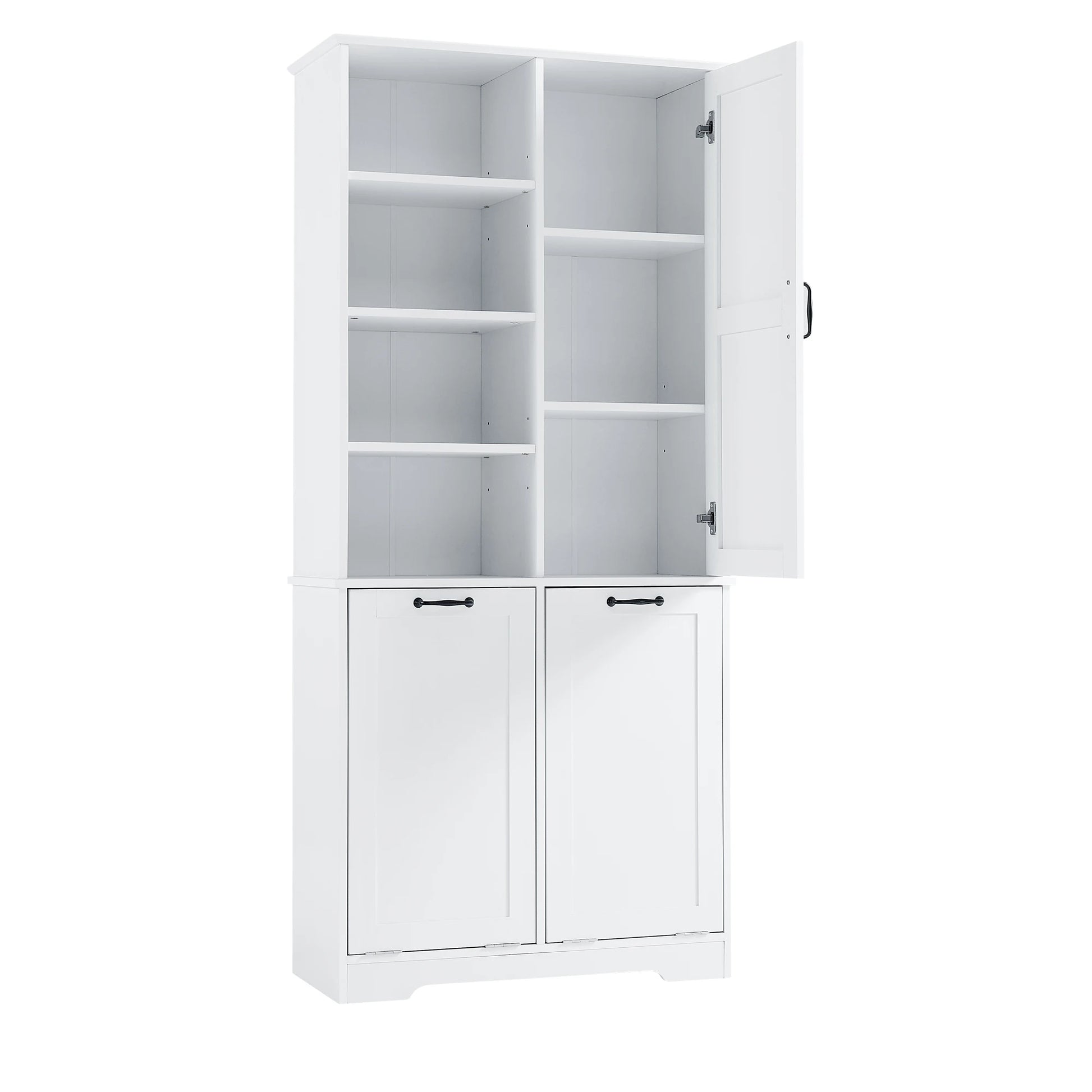 - Ample storage space: Four-layeropen shelves which can be used to place decorations or daily necessities. In addition, the right door is designed with three layers of storage shelves. Two laundry hamper provide more storage space, which can easily place some necessities.