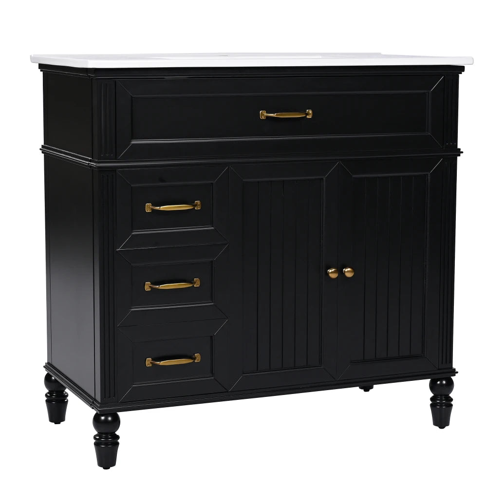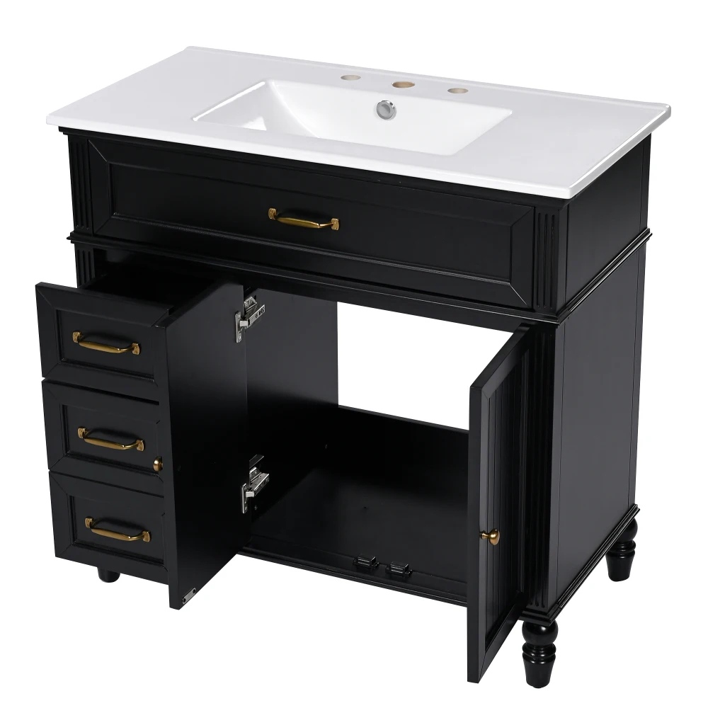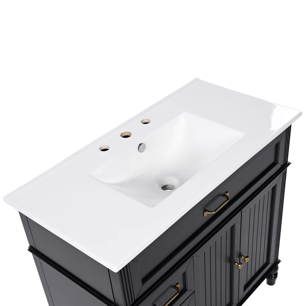 Stylish 36" Bathroom Vanity: This 36" bathroom vanity is suitable for bathroom in any decoration style. Freestanding black vanity cabinet with retro gold handles complies with your bathroom facilities. The groove design on the door and drawer increases the artistry and aesthetics of the home environment. If you're looking for a simple but stylish bathroom sink vanity, our product will be a great choice to upgrade your bathroom.