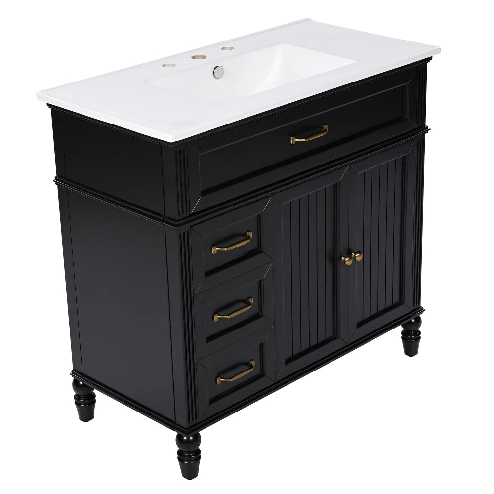 Freestanding 36" Black Bathroom Vanity w/Retro Gold Handles & Ceramic Sink