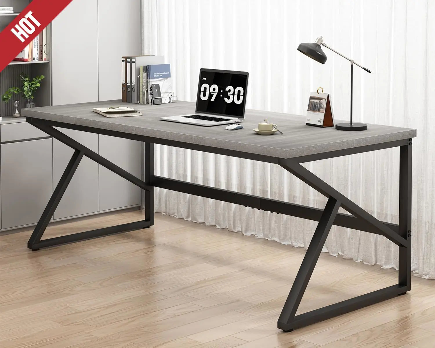 - 【Spacious Work Space & Leg Room】: Measuring 31.5"D x 70.8"W x 29.5"H overall, this long grey desk offers ample space to accommodate multiple monitors, pc, laptop, printers, files, books, lamps and any other office essentials, ensuring you have everything you need within arm's reach for enhanced productivity. The desktop of this large computer desk for 2 monitors is crafted from three meticulously joined panels, creating a cool cross-grain effect. Featuring two K-shaped metal legs with an open structure, this large computer desk for home office provides ample leg room, promoting comfort during extended periods of use.
