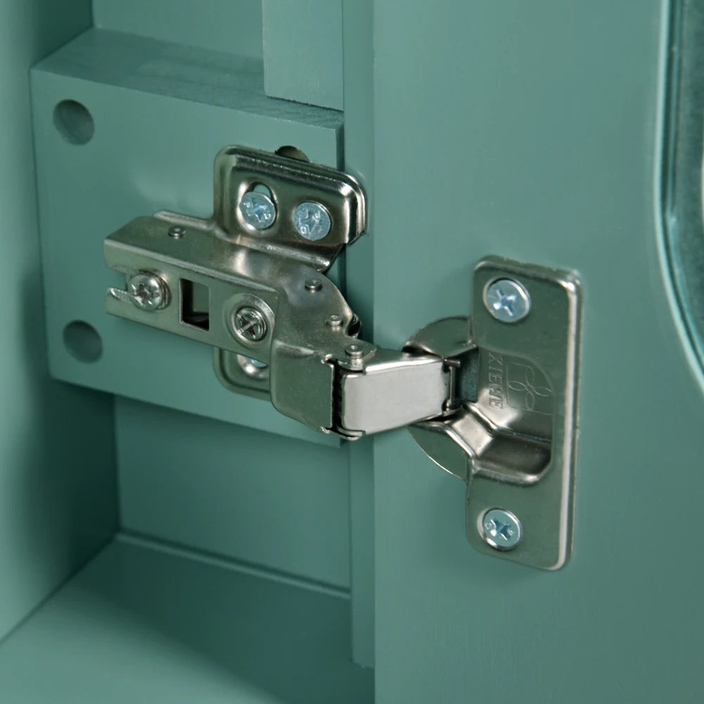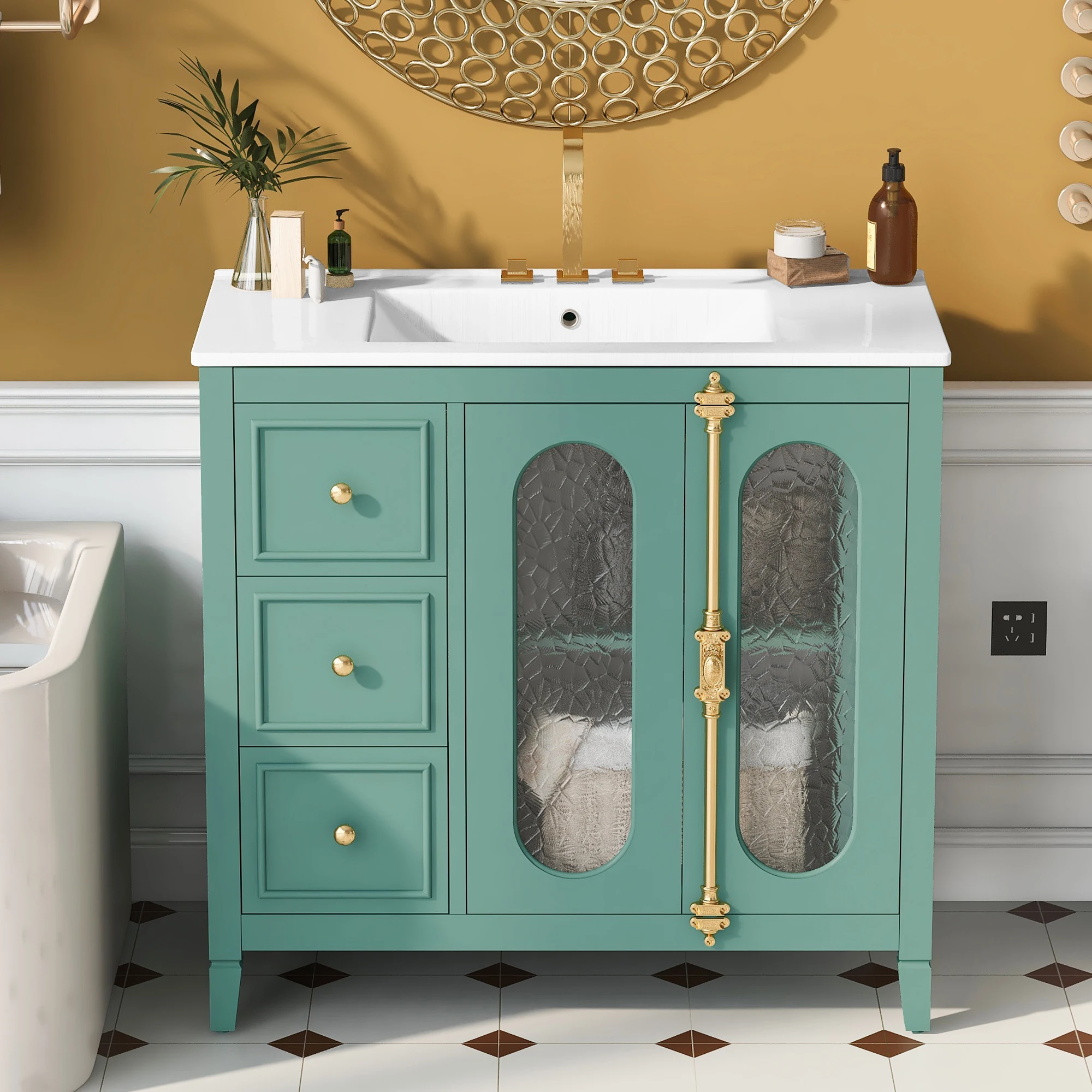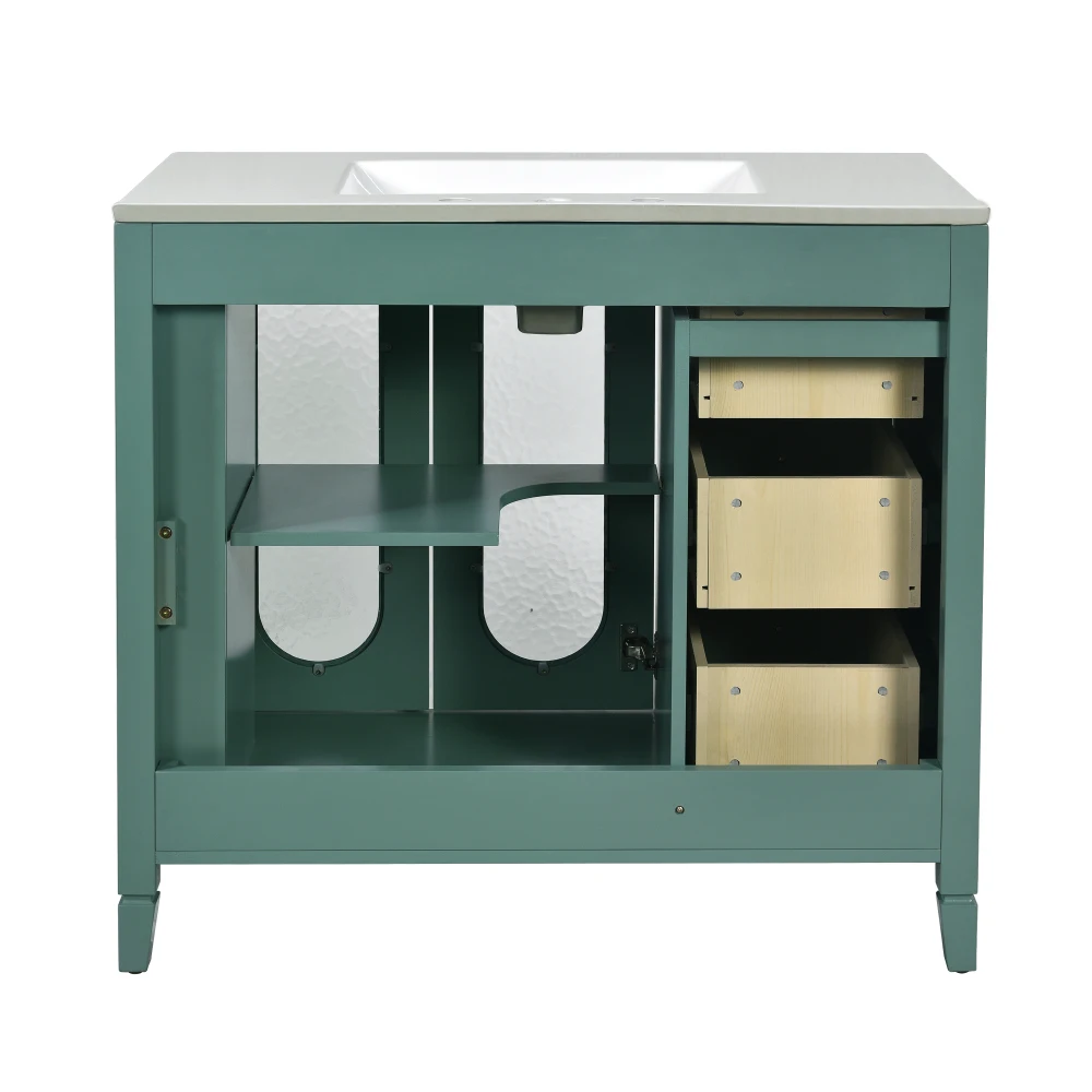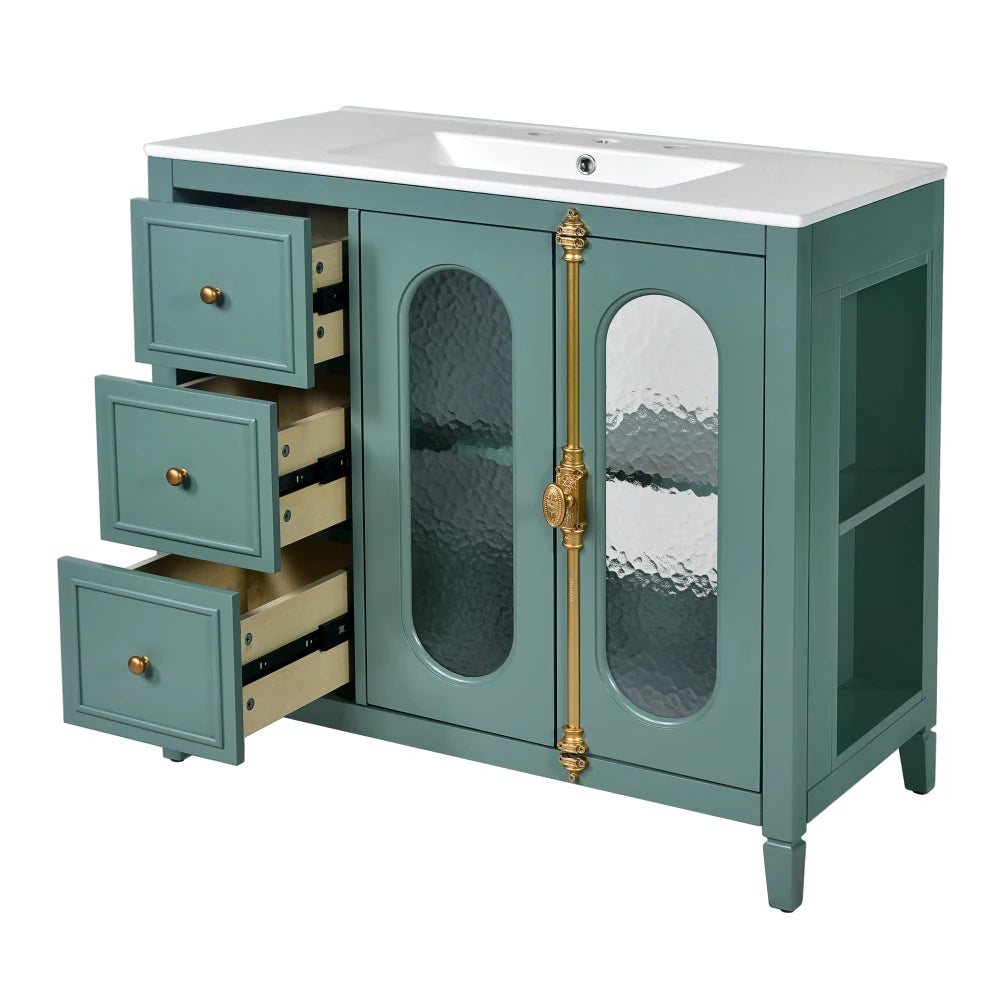 This 36-inch lake green double glass door bathroom cabinet combines modern design and practical functions, and is designed to enhance the overall style of the bathroom. The cabinet body is made of high-quality MDF and solid wood frame, which is sturdy and durable with strong load-bearing capacity. The lake green color is fresh and pleasant, adding a fresh and natural atmosphere to the bathroom. The double glass door design is both modern and translucent, making the entire space brighter and more transparent. The bathroom cabinet is equipped with three practical drawers for convenient storage of daily toiletries and keeping the space tidy and orderly. The central ceramic basin is not only beautiful and generous, but also has excellent waterproof performance, which can easily cope with moisture in the bathroom. Whether it is the classic design or the clever use of space, this bathroom cabinet is the perfect choice for your bathroom storage and decoration. Its simple and generous appearance is suitable for bathroom decoration in various styles, making every bath a pleasure.