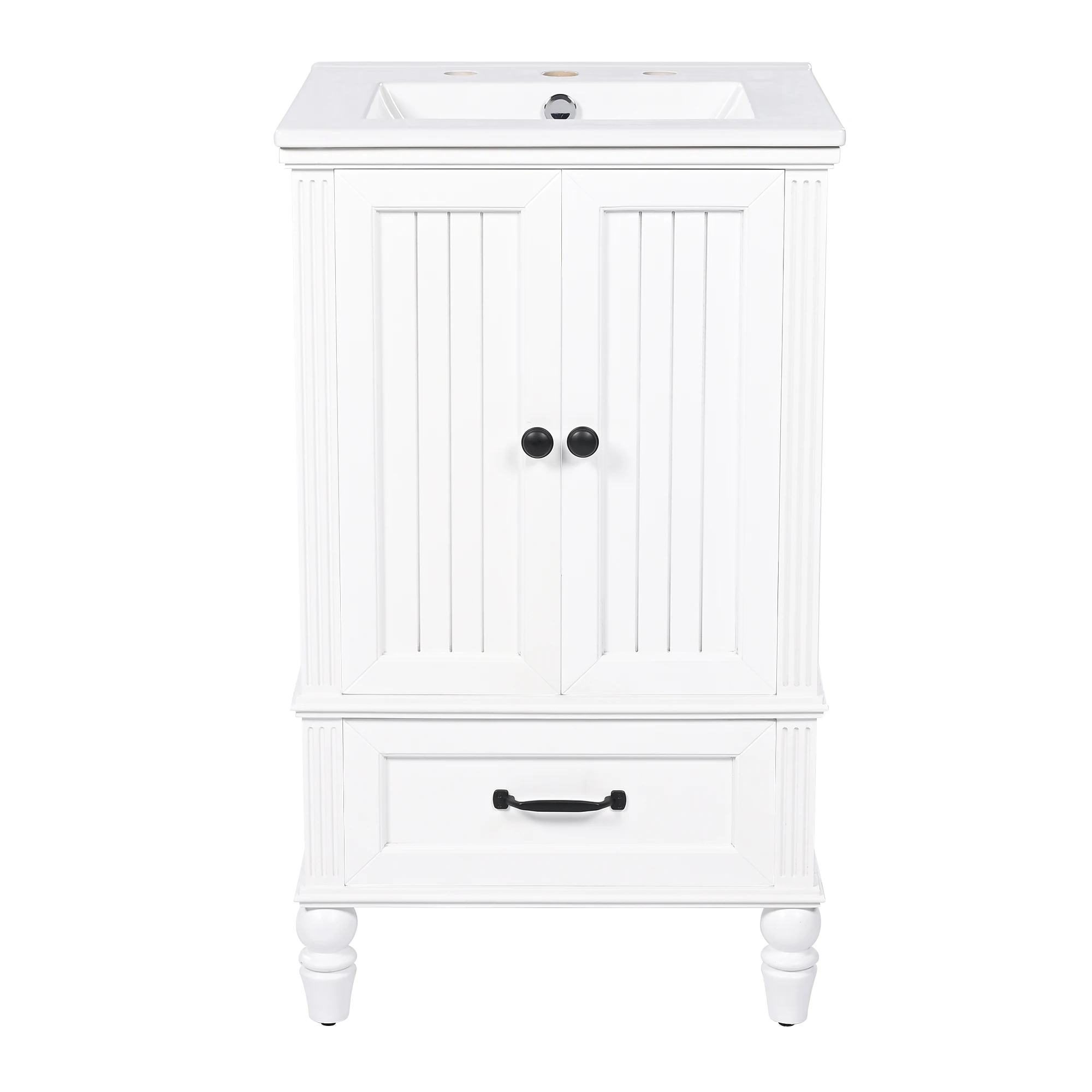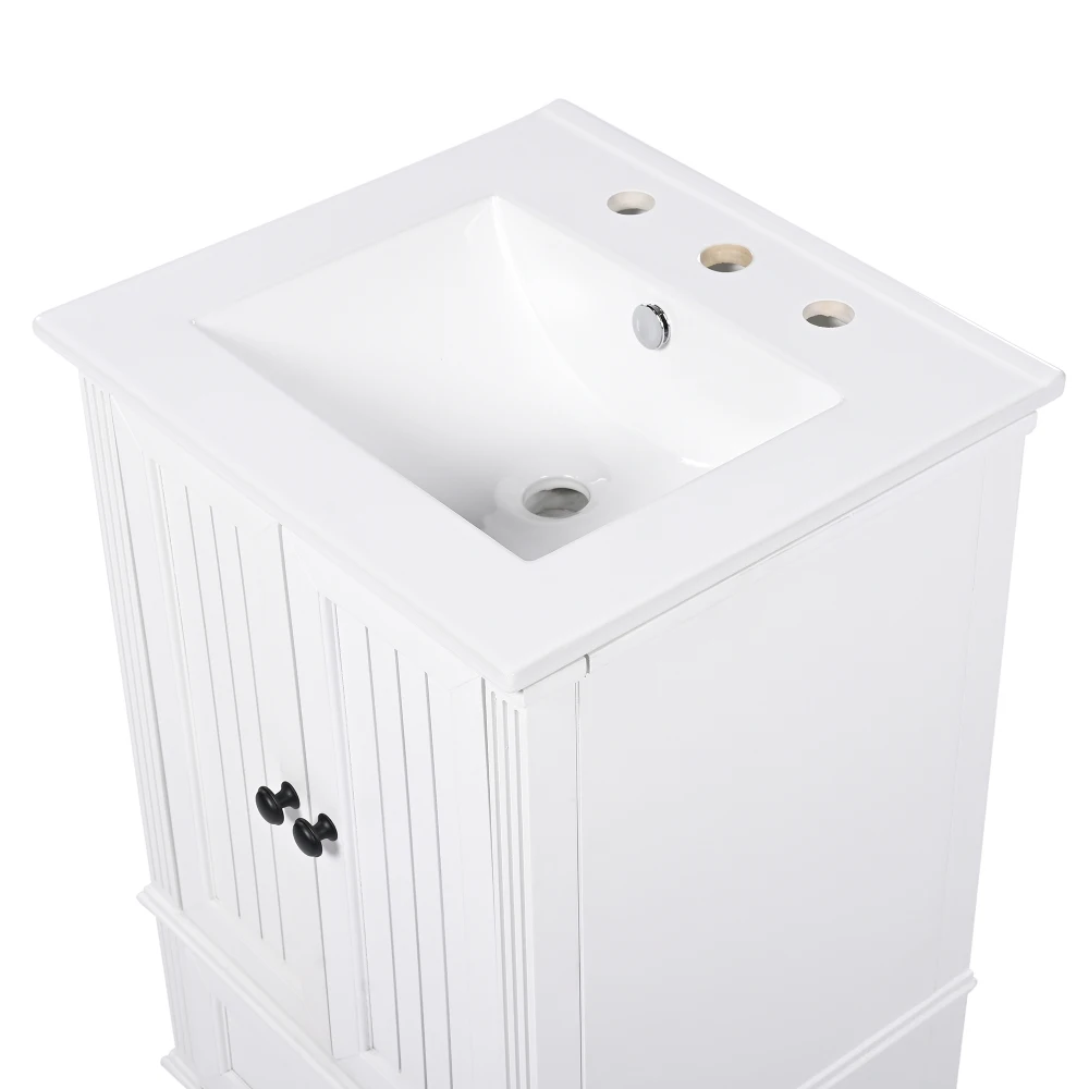 1. 20" Bathroom Vanity with Sink 2. High-quality MDF Board & Ceramic Sink & Painted Finish 3. Cabinet with Doors & One Drawer 4. One Package Details 1. Magnetic Door Stopper 2. Black Metal Handles 3. Stainless Steel Hinges