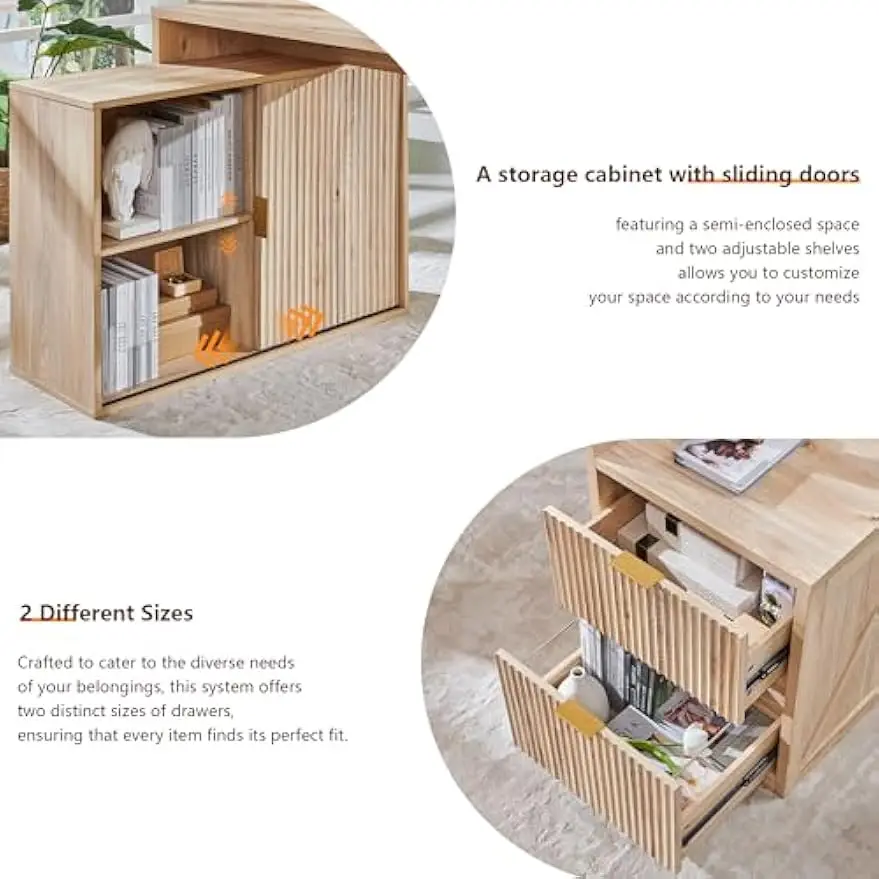 Modern L-shaped Fluted Credenza Desk w/Storage Cabinet & Drawers