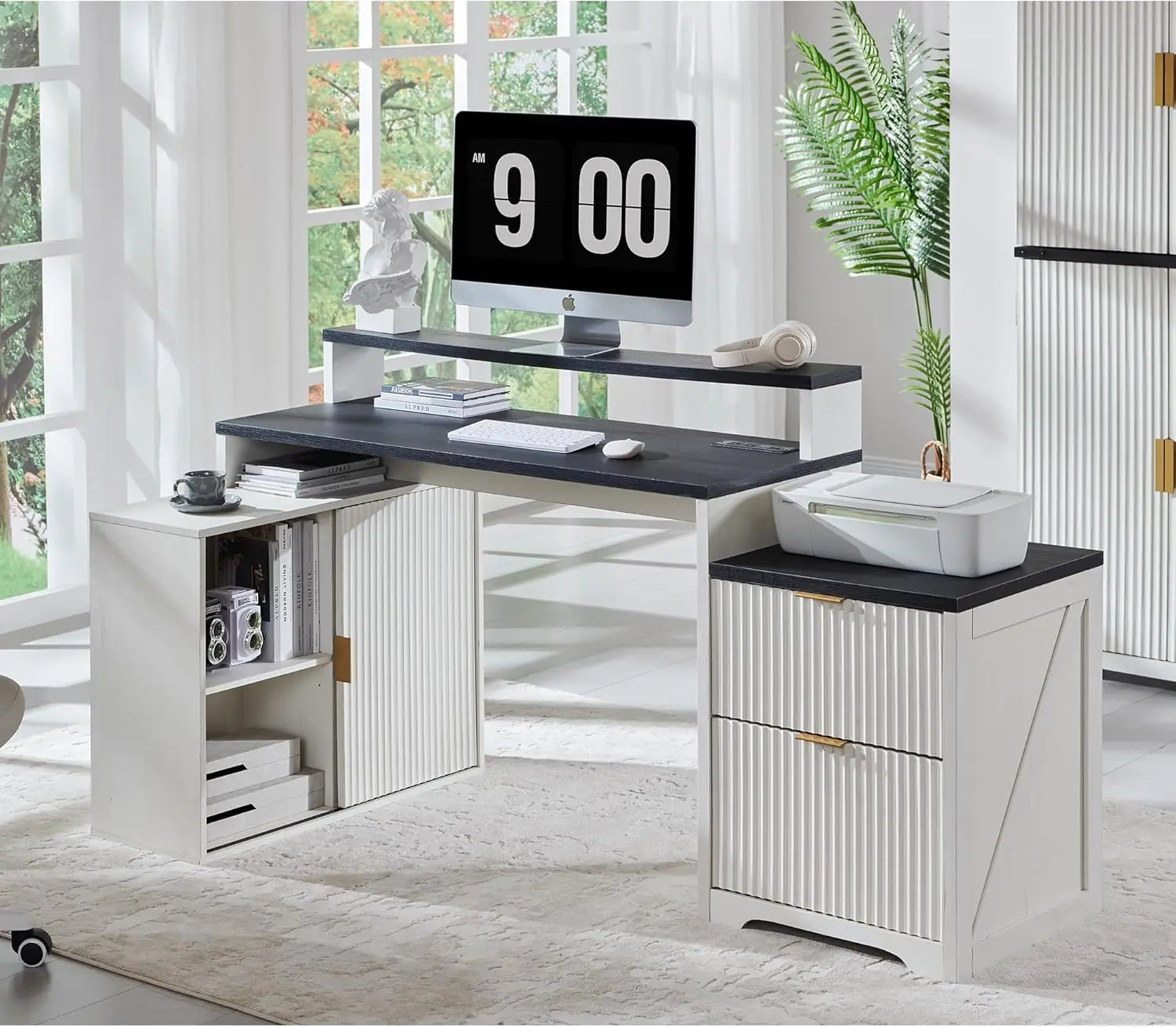 67" Modern L Shaped Desk with Storage Cabinet & Drawers, Wood Home Office Desk with Power Outlets, Fluted Computer Writing Desk, Antique White
